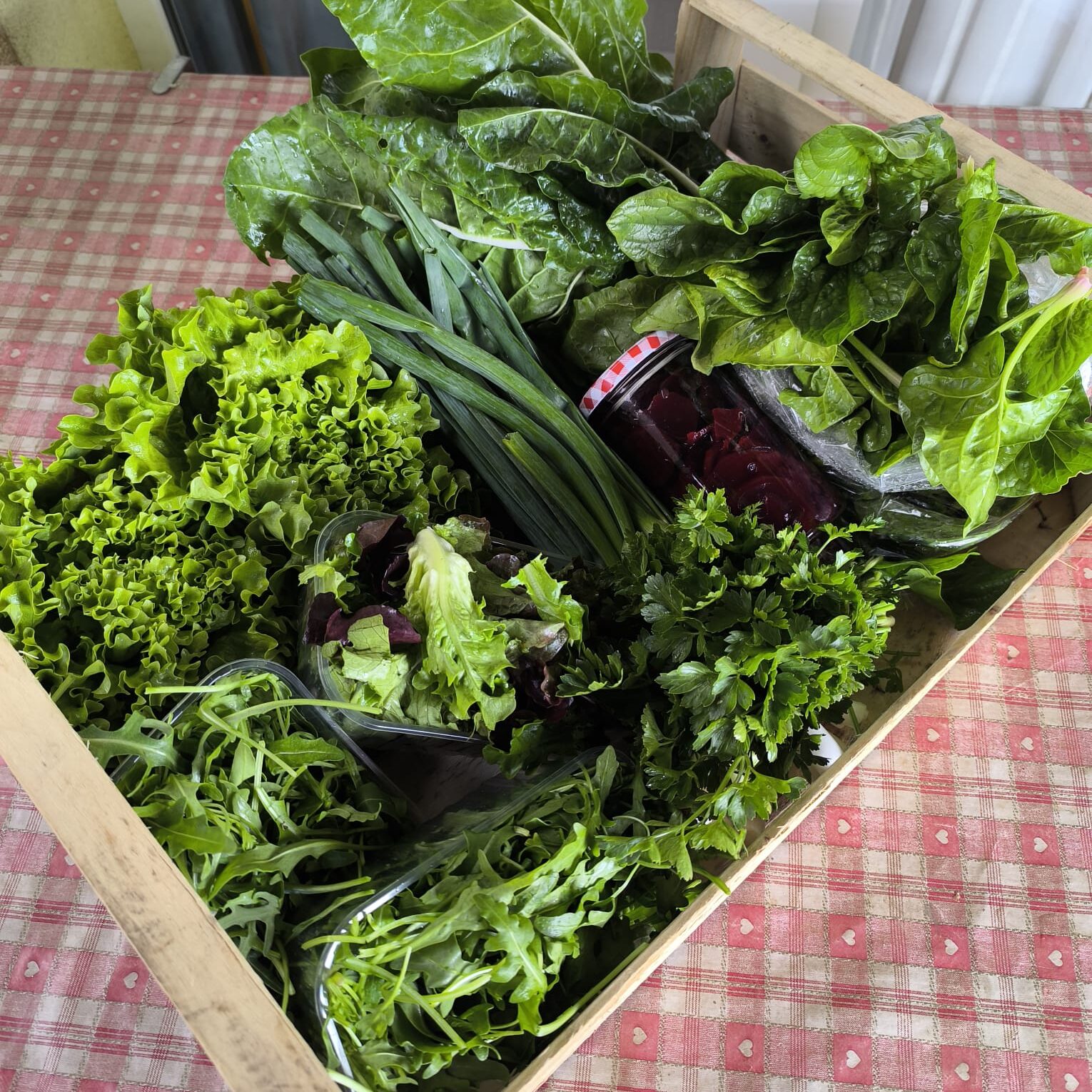 Baby leaf salatica 100 g Blitva pušlek 0,5 kg Mladi luk 2 pušleka Peršin list pušlek Špinat 0,7 kg Eko Rikula 200 g Eko Salata kristalka 1 kg Kisela cikla
